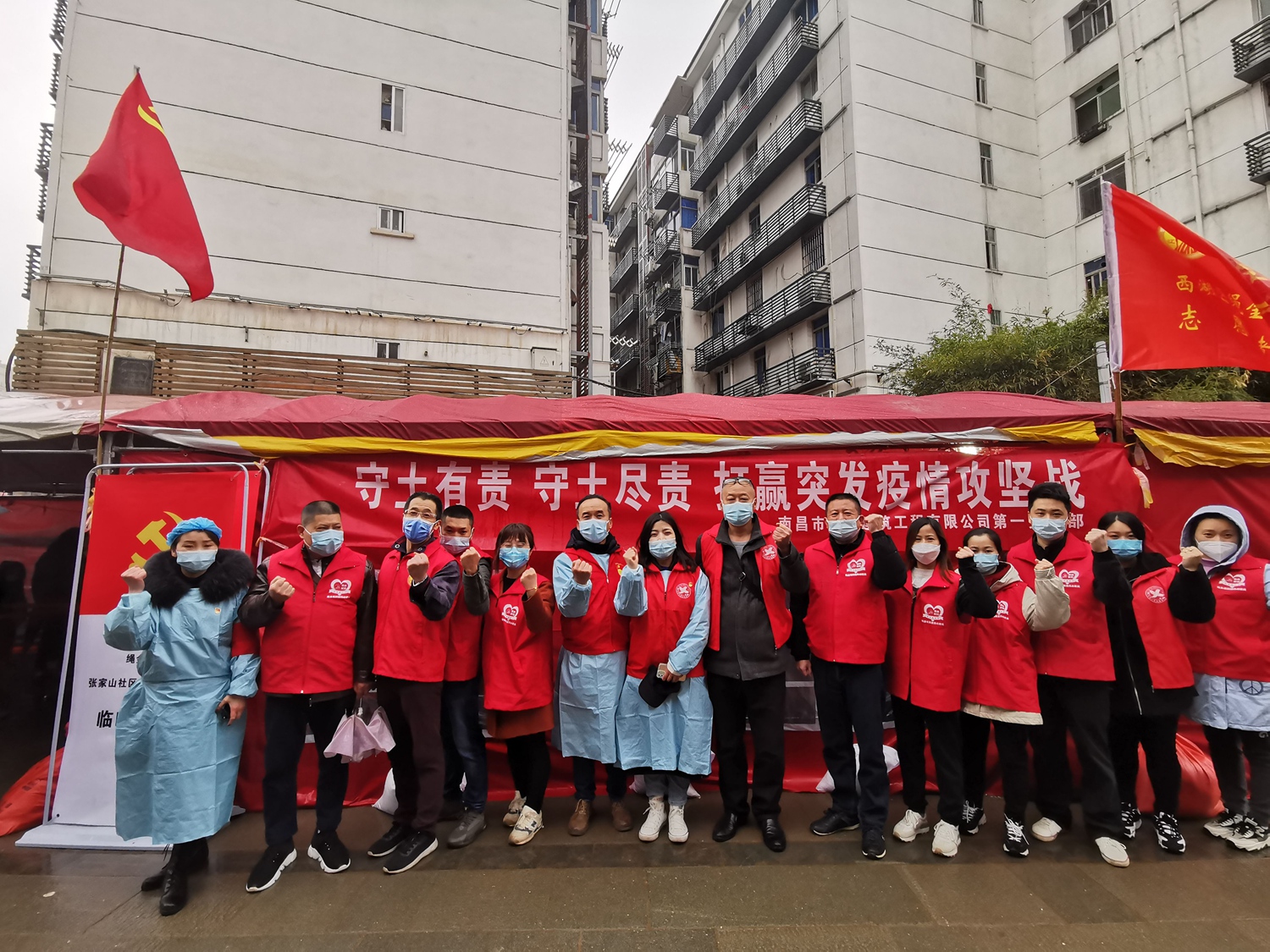 一個(gè)支部就是一個(gè)堡壘。公司第一黨支部將工作前移到疫情防控一線,以黨建共建對(duì)象張家山社區(qū)為點(diǎn),組織黨員和入黨積極分子深入社區(qū)防控一線,開(kāi)展志愿者活動(dòng),對(duì)居民進(jìn)行防控知識(shí)的宣傳教育,在核酸檢測(cè)點(diǎn),幫助疏導(dǎo)交通、維護(hù)秩序,指導(dǎo)居民檢測(cè),動(dòng)員廣大居民積極參與全員核酸檢測(cè),以實(shí)際行動(dòng)投入到防控一線。公司繩金塔民俗風(fēng)情街工程項(xiàng)目臨時(shí)黨支部堅(jiān)持一手抓疫情防控,一手抓工程項(xiàng)目建設(shè)。成立了黨員先鋒崗,主動(dòng)扛起防疫責(zé)任,在做好工地防控設(shè)施圍護(hù)的前提下,堅(jiān)持每天做好進(jìn)場(chǎng)人員的體溫檢測(cè),教育工地人員注意個(gè)人防護(hù),定時(shí)對(duì)工地進(jìn)行殺菌消毒。從而,保證了工程項(xiàng)目在疫情期間不停工、不停產(chǎn) ,體現(xiàn)了黨旗在防控一線高高飄揚(yáng)。